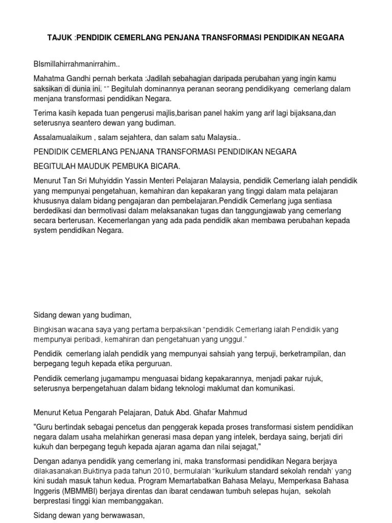 Pada pagi yang mulia ini saya akan menyampaikan pidato yang bertajuk. Sejambak kasih, seharum kasturi buat saudara/ saudari peneraju . Usaha membina negara bangsa yang bersatu padu ini sebenarnya boleh dilakukan jika setiap rakyat mengerti akan kepentingan bahasa kebangsaan . Teks pidato bahasa melayu pendek. Teks pidato bahasa melayu sekolah rendah. Contoh soal to akuntansi contoh teks pidato bahasa melayu.